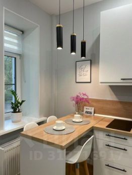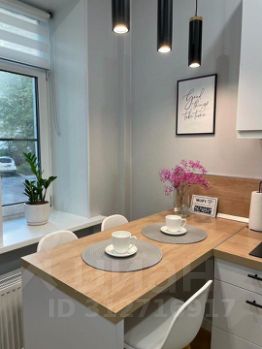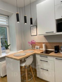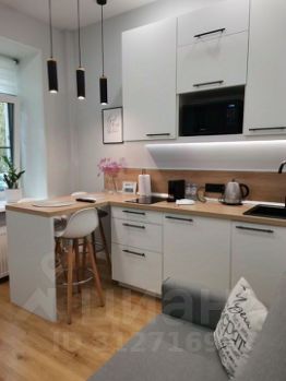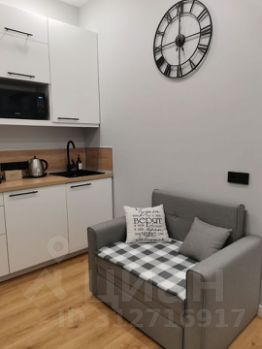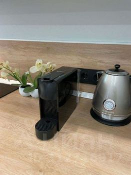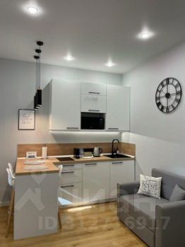 В студии дизайнерский ремонт и есть все необходимое для комфортного проживания. Кухня, укомплектована всем необходимым: плита, холодильник, кофемашина, посуда, микроволновка.
