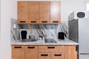* Кухня: плита, холодильник, микроволновка, чайник, посуда