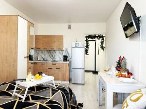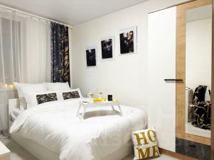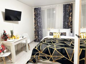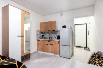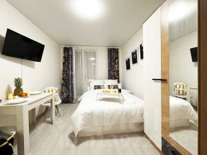 Сдаётся студия посуточно в Девяткино, СПб, современная квартира для пары с двуспальной кроватью и кухней со всей техникой. Новый ЖК с закрытой территорией, детскими площадками и зонами отдыха.