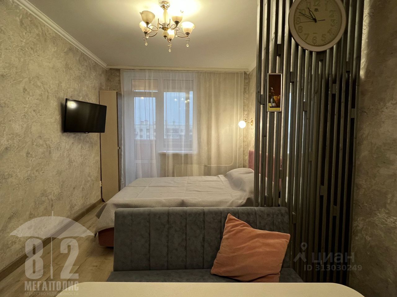 ЗОНА ОТДЫХА: отделена реечной стенкой. Удобная двуспальная КРОВАТЬ с подземным механизмом и ортопедическим матрасом. Шкафы, прикроватные тумбочки, телевизор.