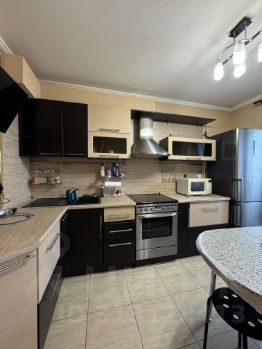 духовкой, вытяжка, эл.чайник, микроволновая печь, телевизор, угловой диван, кухонный стол.