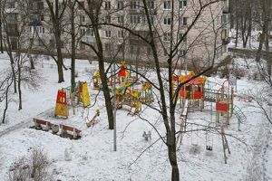 Окна в тихий зеленый двор. Во дворе есть детская площадка.