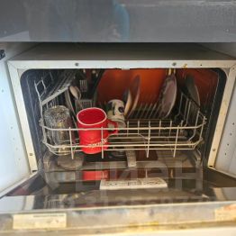 холодильник, посудомоечная машина, посуда, столовые приборы и все для приготовления еды.