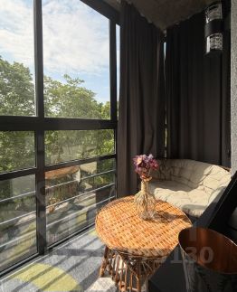 Большой балкон с панорамным остеклением и небольшим диванчиком для отдыха.