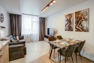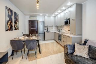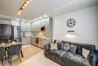 В квартире сделан новый качественный евроремонт. Просторная кухня-гостиная оборудована всей необходимой техникой: холодильник, посудомоечная машина, телевизор. В спальне и в кухне-гостинной новая современная мебель. Вторая комната пустая, мы приобретем мебель по клиента. В ванной комнате установлена ванна. Планировка квартиры включает одну лоджию и один балкон, окна выходят как на улицу, так и во двор.