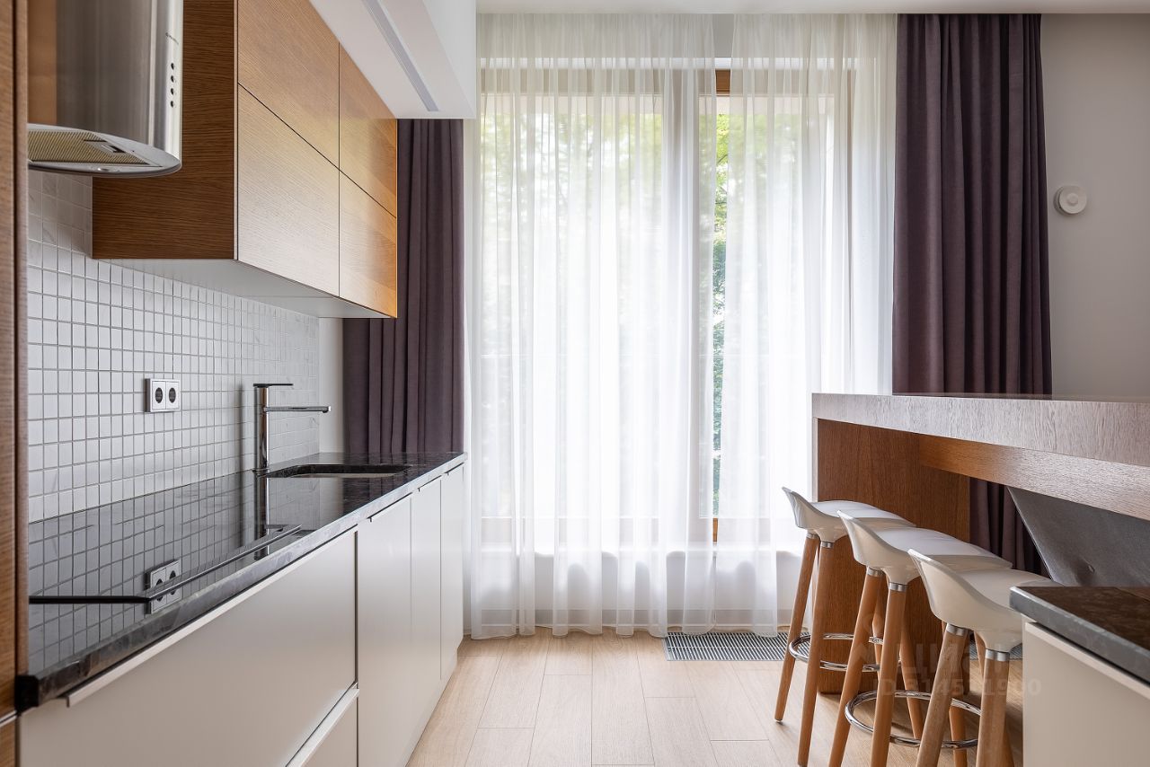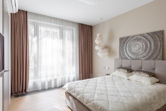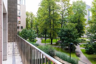 Кухня-гостиная - 40 кв.м, мастер спальня - 19 кв.м. со своим сан.узлом - 7кв.м., свободная комната- 17 кв.м. , гостевой сан.узел, хоз.-бытовой блок (постирочная). Балкон по всему периметру квартиры с видом на зеленый двор.