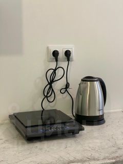 -Кухонная зона, где есть электрический чайник, плита, микроволновая печь и холодильник;