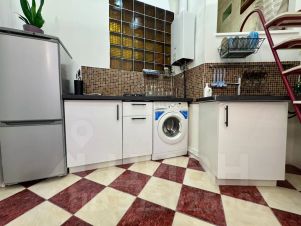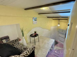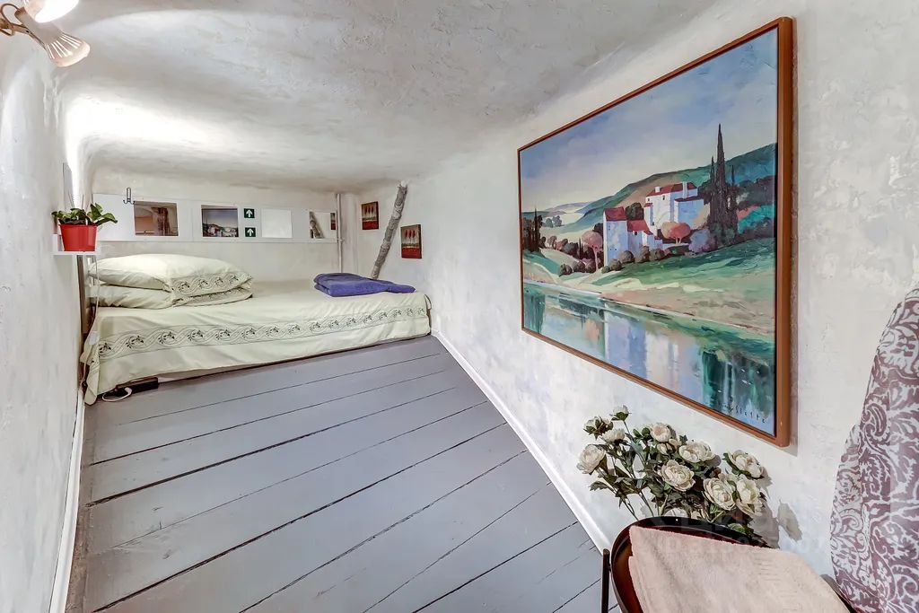 По лесенке на кухне сделана дополнительная мини-спальня с невысоким потолком, как комната-капсула, в стиле прованс, с картиной и штукатуркой, пол из отреставрированного деревянного бруса, где расположена двуспальная кровать (140х200).