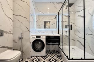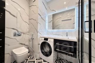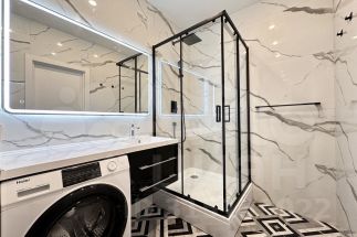 Просторный совмещенный санузел 5,3 м² , большая душевая кабина, шкаф для хранения, стиральная машина.