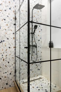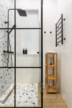 - Современную ванную комнату с большой душевой кабиной, качественной сантехникой, белоснежными полотенцами и косметическими средствами: шампунь, гель для душа, мыло и туалетная бумага.