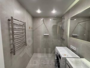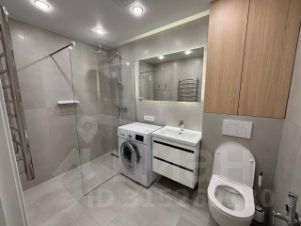 • Санузел и ванная комната совмещены (4,81 м²): вся сантехника AM.PM, инсталляция Geberit, просторная душевая без порога, гигиенический душ и подвесной унитаз. Установлен электрический водонагреватель, новая стиральная машина LG и тёплые полы. Также имеется шкаф для хранения и подвесная тумба.