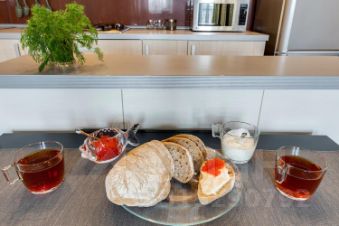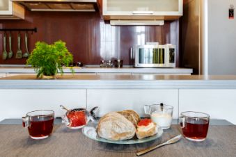 Современный кухонный гарнитур с электрическим чайником и микроволновкой, а также посудой, позволяющей приготовить и насладиться домашними блюдами;