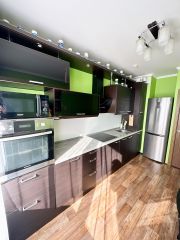 Новая бытовая техника (встроенная варочная поверхность, встроенный духовой шкаф, холодильник, стиральная машина, вытяжка, микроволновая печь, телевизор) и новая мебель (встроенная кухня, стол, стулья, шкаф-купе зеркальный, стенка под ТВ, зеркало, диван-кровать 2СП, шкаф, полка навесная, пенал).