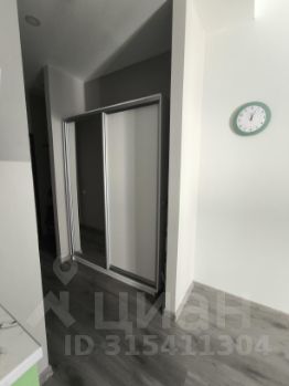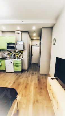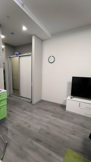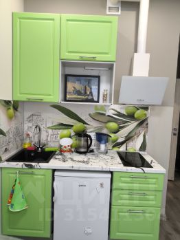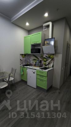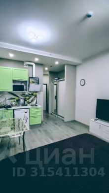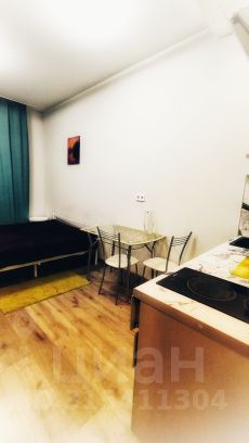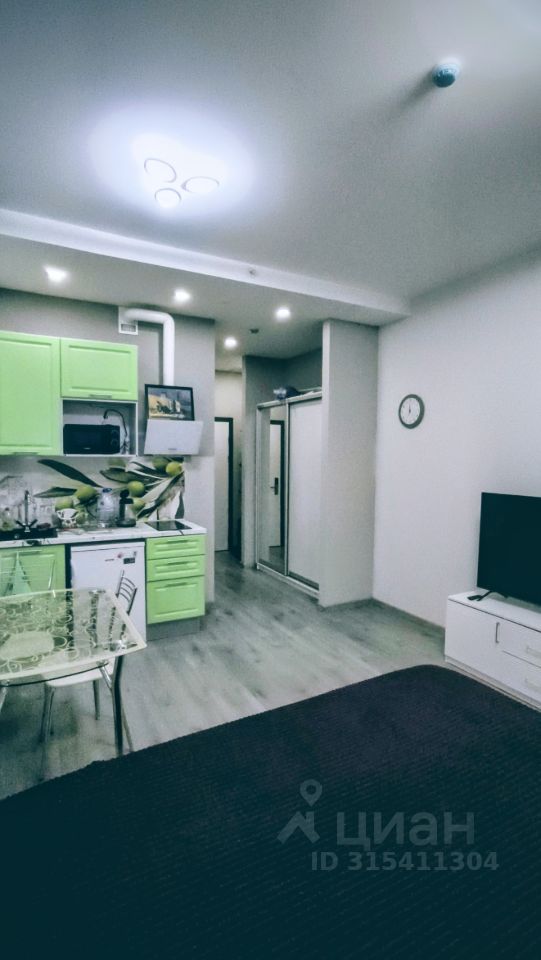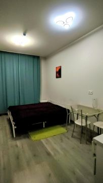 Студия выполнена с косметическим ремонтом, обставлена мебелью и полностью готова к проживанию. В студии есть всё необходимое для комфортной жизни. Ванная комната оборудована душевой кабиной, раковиной и зеркалом с подсветкой. Из техники в наличии чайник, холодильник, микроволновка, варочная панель, телевизор и стиральная машина. Окна выходят во двор, поэтому в квартире всегда тихо и спокойно.