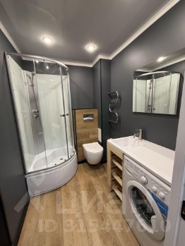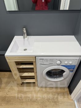 Санузел совмещённый. Большая ванная комната с душевной кабиной, навесной раковиной-столешницей и стиральной машиной. Есть ниша, в которую отлично вписался стеллаж и место для хранения.