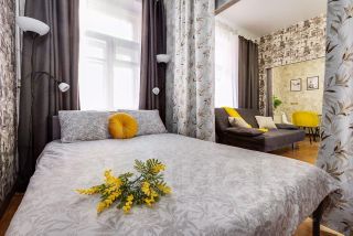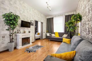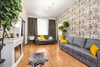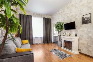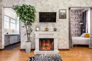 В гостиной два раскладных дивана, камин, дополнительный рабочий стол, окна на 2 стороны.