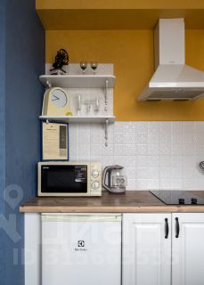 Полностью оборудованный кухонный гарнитур с электрическим чайником, микроволновкой, холодильником и всей необходимой посудой для приготовления, также обеденный стол и стулья.