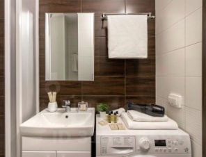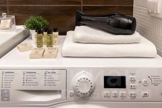 Собственный санузел, где есть душ и туалет. Стиральная машина, утюг и фен для вашего удобства.