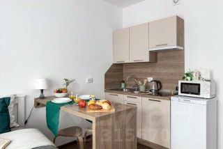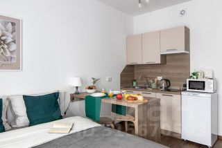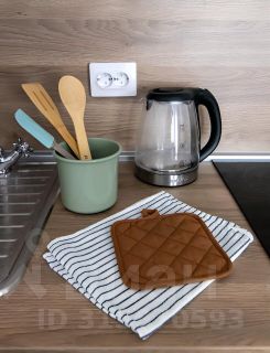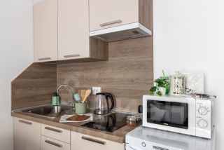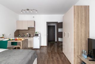 Кухонная зона оборудованная всей необходимой бытовой техникой (чайник, микроволновая печь, мини холодильник, плита) и посудой для приготовления. Также обеденный стол и стулья;