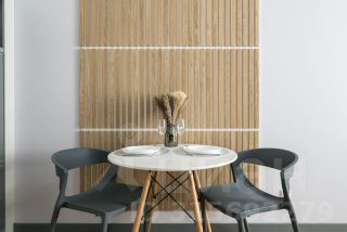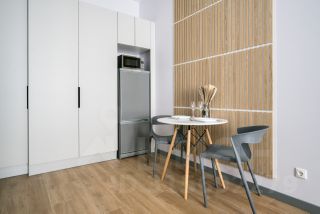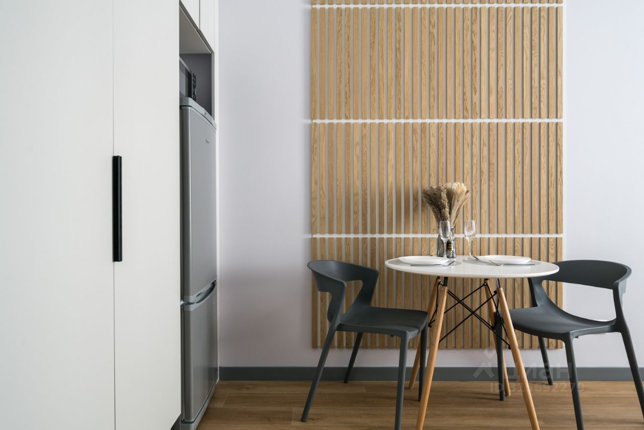 Кухонная зона: полностью оборудованный кухонный гарнитур с электрическим чайником, микроволновкой, холодильником и всей необходимой посудой для приготовления, также обеденный стол и стулья.