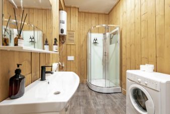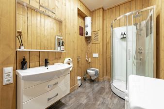 - В ванной комнате: туалет, душ, стиральная машина, набор гигиенических средств, тапочки, полотенца для ног, рук и тела на каждого гостя.