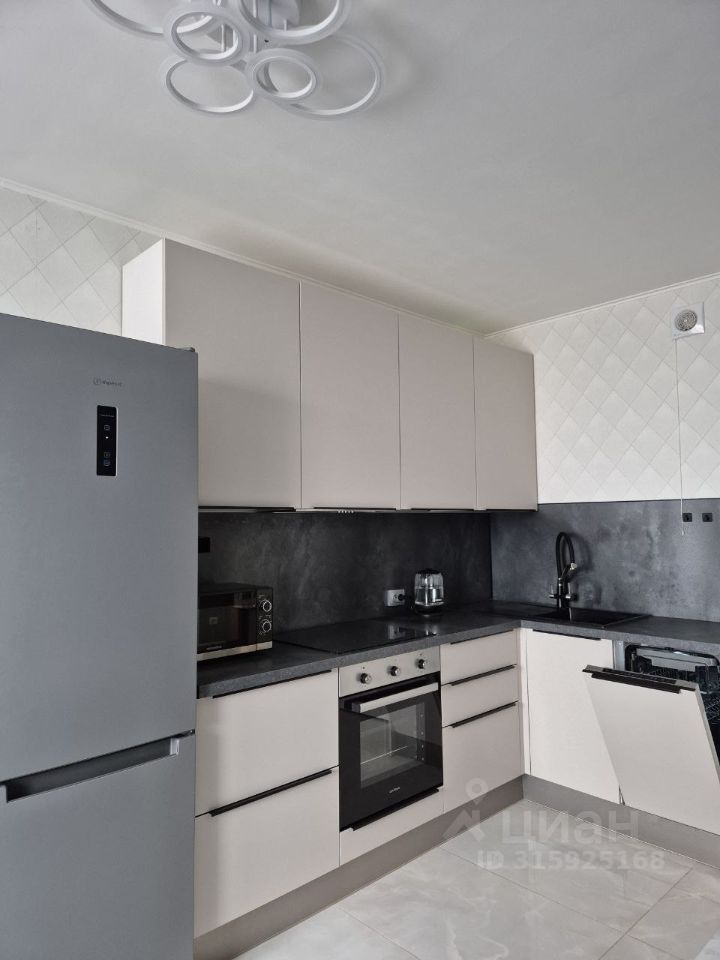 Большая кухня 14 м² с новым кухонным гарнитуром от компании Hoff. Для комфортной жизни имеется посудомоечная машина и фильтр для очистки воды компании "Аквафор". Также большой раскладной стол в мрамором стиле, мягкие велюровые стулья, раскладной диван и плазменный телевизор.