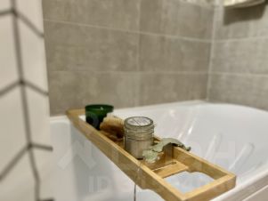 В просторном совмещенном санузле разместились ванна, электрический полотенцесушитель, зеркало, аксессуары для душа.