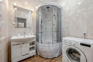 В ванной комнате душевая кабина, чистые полотенца, мыло, шампунь, кондиционер для волос, гель для душа.