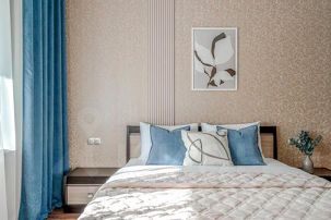 В спальне удобная двуспальная кровать с ортопедическим матрасом; телевизор со SMART-TV.