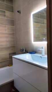 На кухне имеется: Холодильник, СВЧ печь, плита, чайник, посуда, кухонные принадлежности, телевизор с функцией SMART,