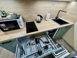 - В кухонной зоне: микроволновая печь, холодильник, посудомоечная машина, чайник, плита, посуда и столовые приборы на любой случай. Чай, кофе, сахар, соль, конфеты.