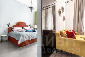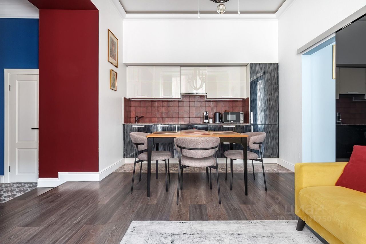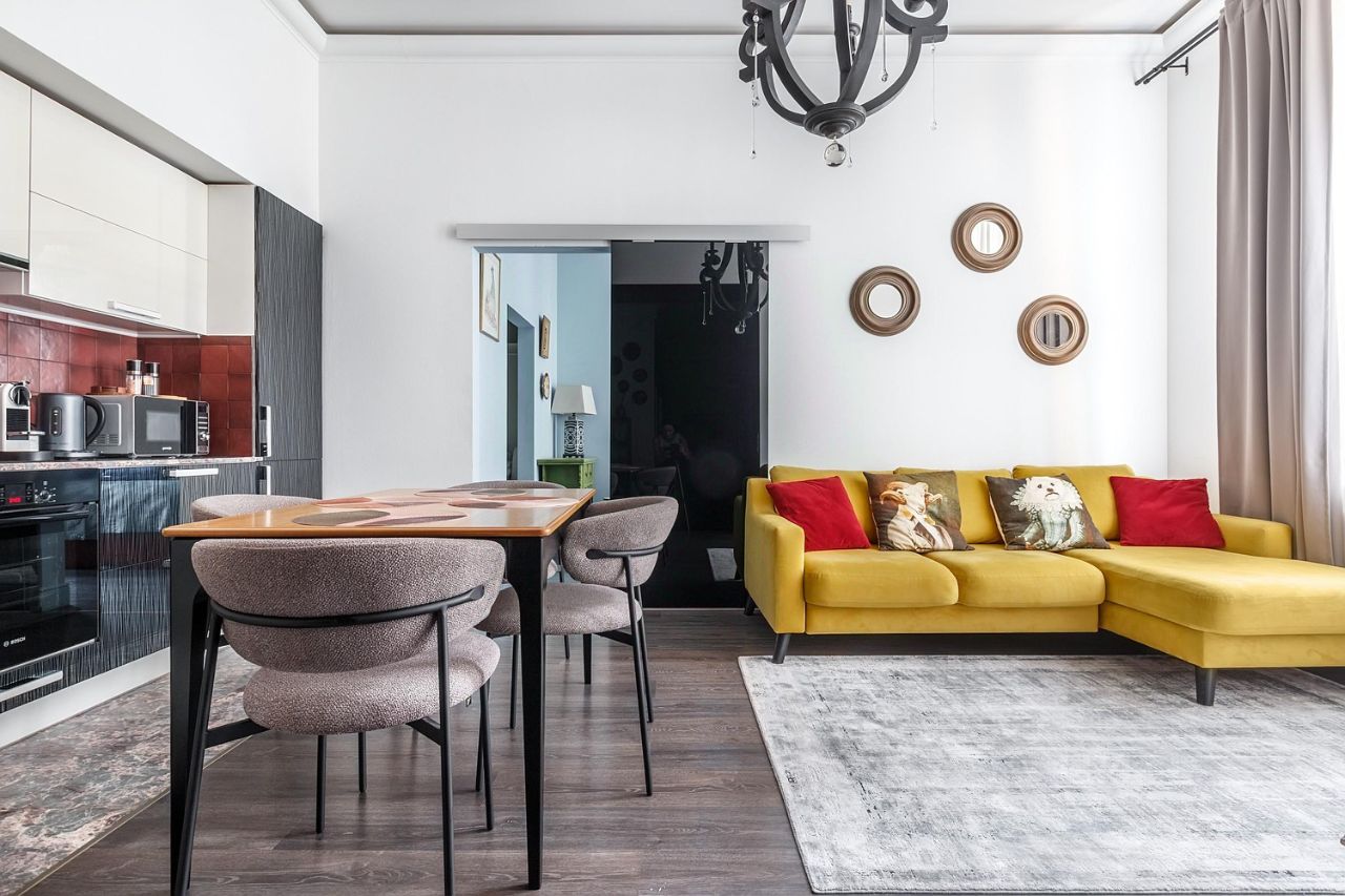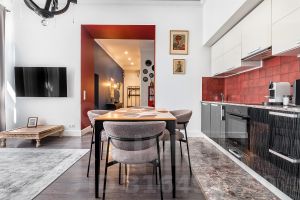 Уютная дизайнерская квартира-студия в тихом дворике исторического центра Петербурга, кухня-гостиная с отдельной спальней и гардеробной комнатой.