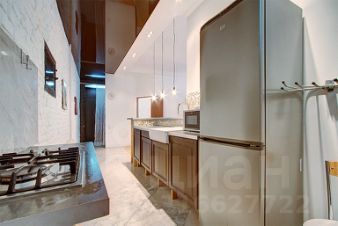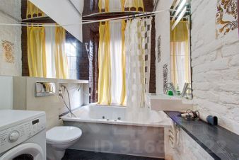 Квартира, оформленная в современном дизайне (кирпичные стены, минимум мебели, напольные светильники, барная стойка со стульями, зеркальный потолок и окно в ванной комнате), состоит из спальни, гостиной с кухонной зоной и ванной комнаты.