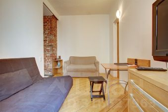 Апартаменты находятся на 3 этаже четырехэтажного дома (без лифта) и могут быть арендованы вместе с ID 346, расположенной в том же доме и оформленная в таком же стиле (кирпичные стены, минимум мебели, напольные светильники, барная стойка, зеркала).
