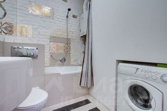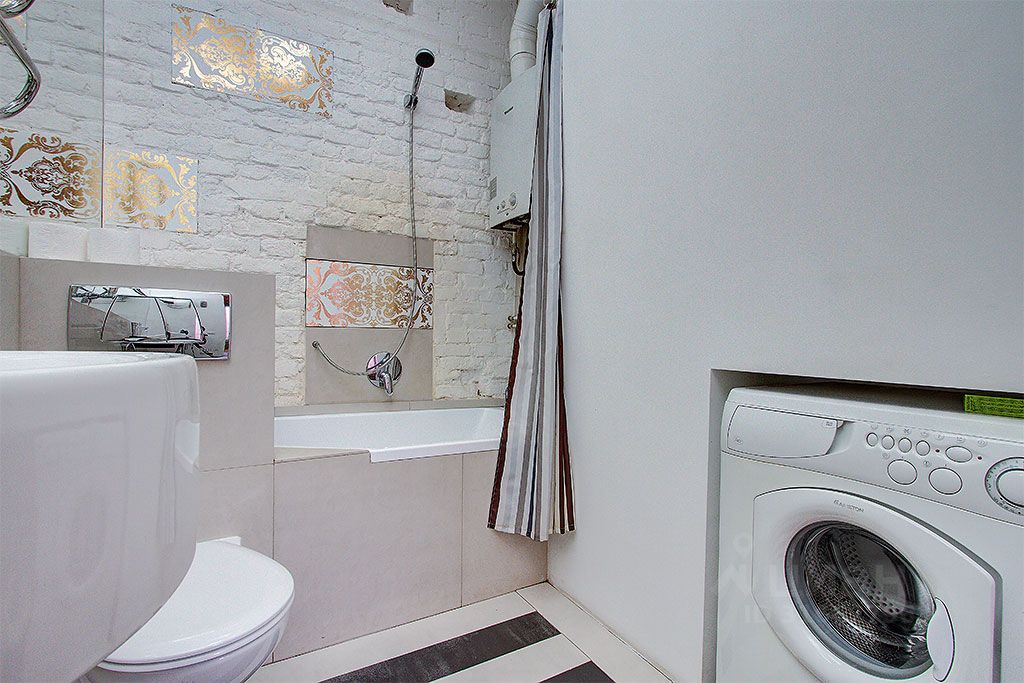 В ванной комнате (санузел совмещенный) ванна, раковина, туалет, фен и стиральная машина.