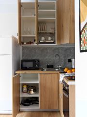 Кухня полностью укомплектована бытовой техникой и посудой для приготовления и сервировки еды.