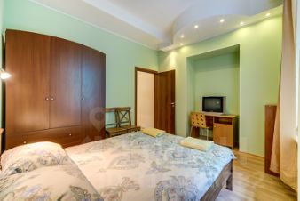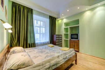 В гостиной - комплект мягкой мебели, включая раскладывающийся диван, обеденный стол со стульями, стелаж, письменный стол, комод, телевизор. Поскольку все комнаты изолированные, в квартире могут с комфортом разместиться 3 пары.