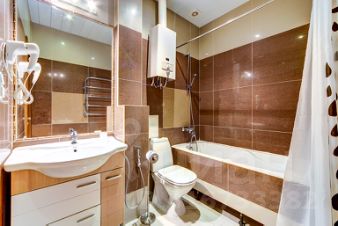 Санузел совмещенный. В ванной комнате находится ванна, раковина, туалет, фен.