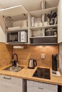Кухня со всем необходимым. Электрическая плита, холодильник, чайник, микроволновая печь, вся необходимая посуда и кухонные принадлежности;
