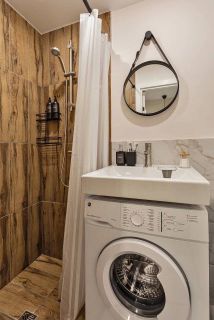 Душ, стиральная машина, чистые полотенца, жидкое мыло для рук, шампунь/гель для душа