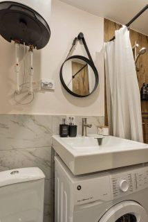 Душ, стиральная машина, чистые полотенца, жидкое мыло для рук, шампунь/гель для душа