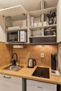 Кухня со всем необходимым. Электрическая плита, холодильник, чайник, микроволновая печь, вся необходимая посуда и кухонные принадлежности;