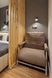 Спальная зона с двуспальной кроватью 140х200 и одноместным раскладным креслом. Свежее постельное бельё. Телевизор с кабельными и цифровыми каналами SМАRТ ТV, бесплатный Wi-Fi.