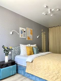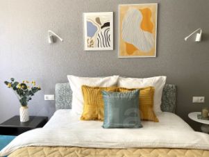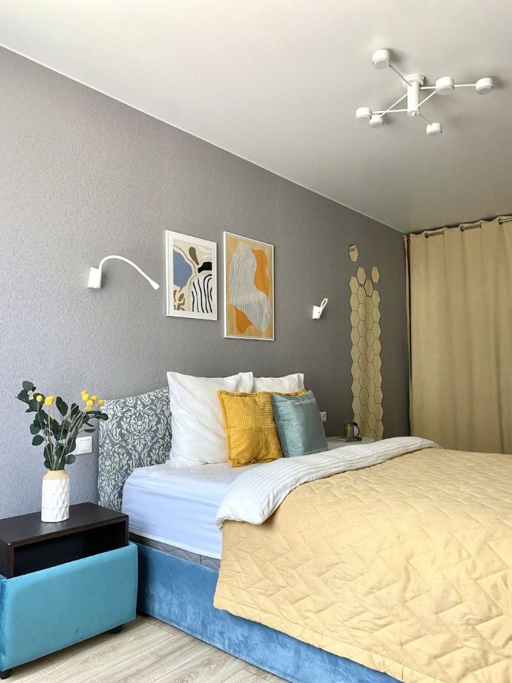 *В спальне: кровать с высоким ортопедическим матрасом и гардеробная.