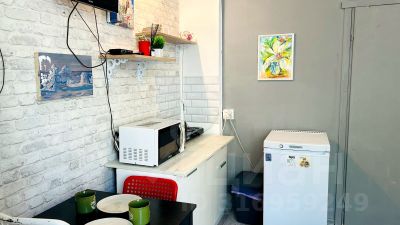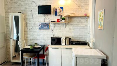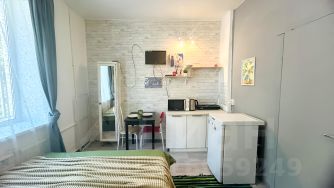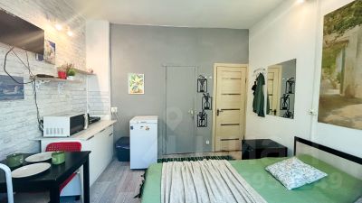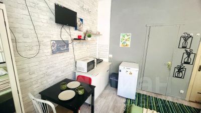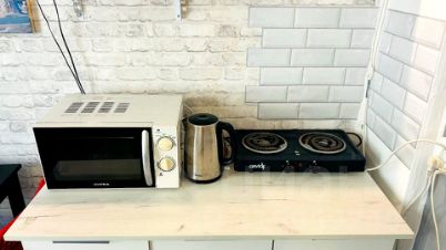 В студии: двуспальная кровать 160*200, холодильник, столешница с плитой, СВЧ печью, чайником и электрической плиткой, стол и два стула, а также санузел ( ванная, туалет, стиральная машина).