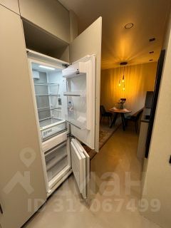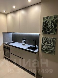 Кухня без ручек с импортными доводчиками. Оборудована индукционной плитой, вытяжкой, духовкой, встроенным холодильником.