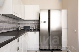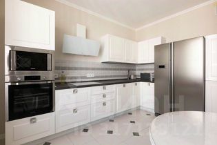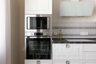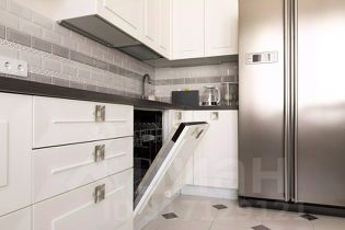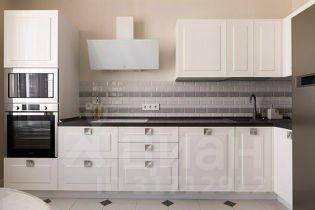 Полностью укомплектованная кухня: индукционная плита, посудомоечная машина, чайник, духовка, микроволновая печь, холодильник, посуда и столовые приборы.