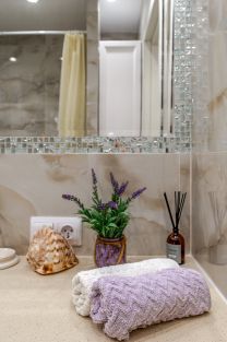 Апартаменты оснащены вместительной зоной хранения, стиральной машиной, феном. Гладильная доска и утюг также находятся в апартаментах. Белоснежное постельное белье, комплект полотенец на каждого гостя (гель для душа, шампунь ватные диски и палочки).