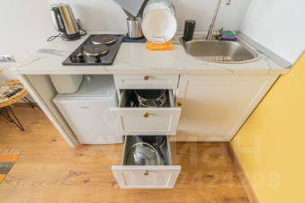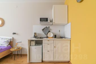 Спальня совмещена с кухонной и обеденной зоной.