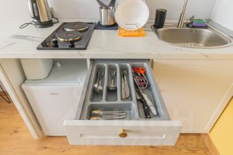 - обеденная зона (холодильник, чайник, микроволновка, плита, столовая группа, посуда на 2 персоны, стол со стульями)